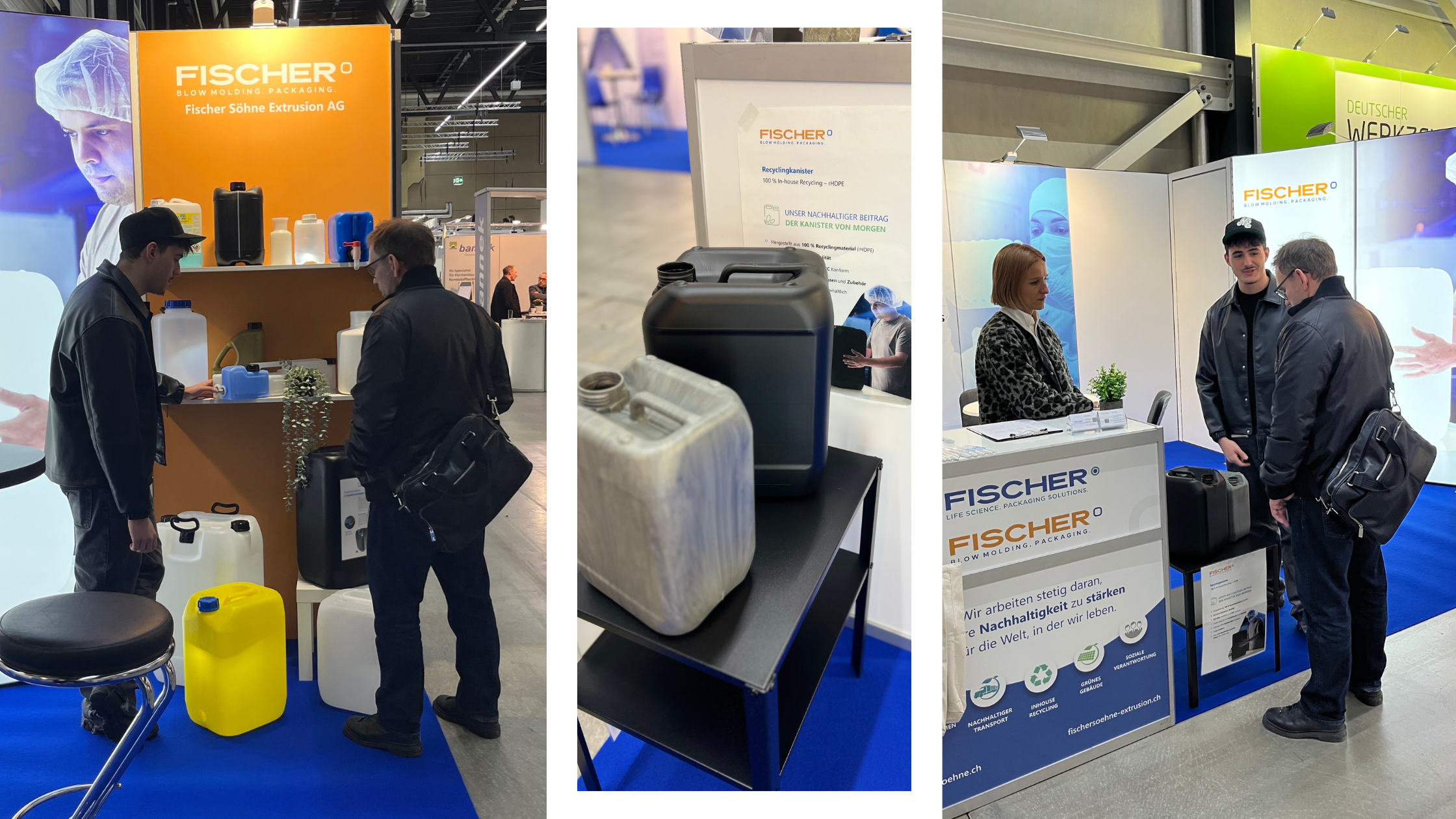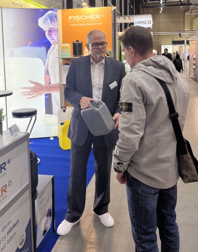 100 % recycelter Kanister (internes Recyclingmaterial). Die Fischer Söhne Extrusion AG präsentierte einen Kanister, der vollständig aus internem Recyclingmaterial hergestellt wurde: Produktionsabfälle werden vor Ort gemahlen und wieder in den Prozess zurückgeführt – ein konkreter Schritt in Richtung der EU-Ziele für 2030 und ein praktischer Beweis für Kreislaufwirtschaft.